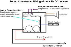 Mode The board will work wired just to the track voltage for non TMCC applications. Note there are a couple of jumper options for controlling the sounds in conventional mode. See drawing for details. These jumpers effect operation in conventional whether using with TMCC receiver or with out. |