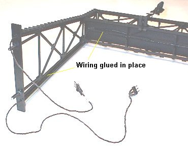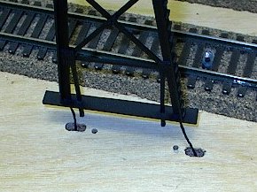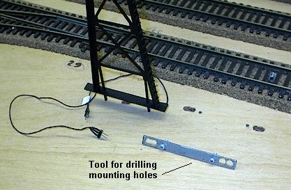 | Mounting pins are from the original sides going through holes drilled in the new base slipping into holes in the train board. Slotted holes are for the wires and connectors. The template tool makes drilling a snap. | |