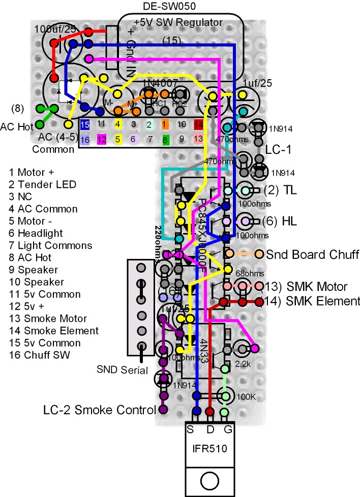 The SHS 2-8-0 Loco electronics uses +5 volts DC and the TMCC circuits use AC track voltage so care must be used to keep them isolated from each other. This was done by using opto-isolaters and the separate +5 volt supply. |