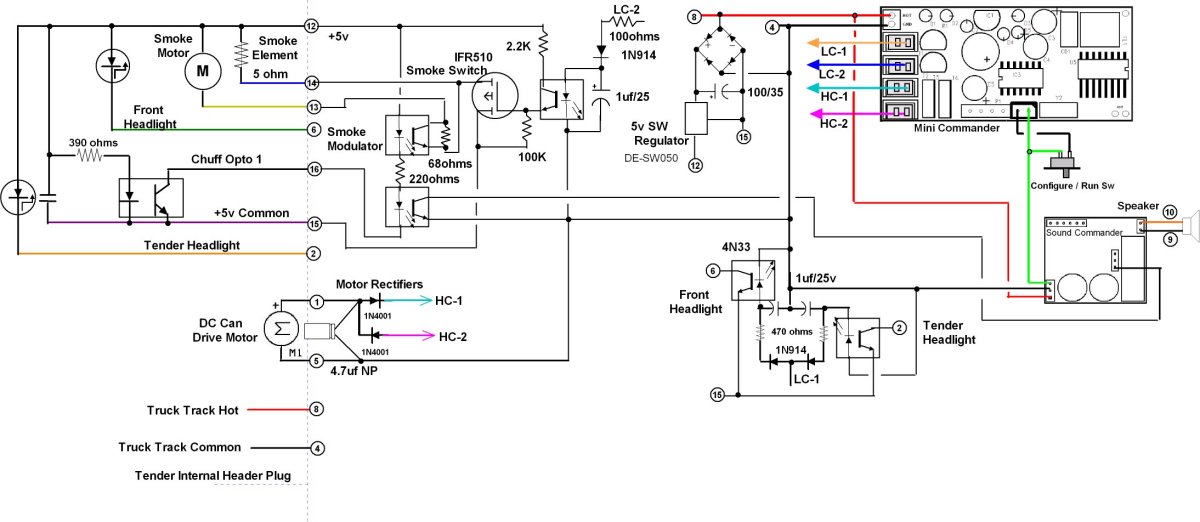 an amp or more. LC-2 controls the smoke feature (Aux1, 8 smoke off and Aux1, 9 smoke on) The Mini Commander must be programmed to be a "type 6" for the features to work properly. |