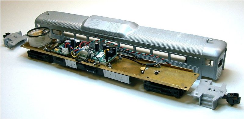 "S" gauge Budd RDC (Rail Diesel Car). An ERR Sound Commander was also part of the conversion. I used one of my own design speakers and it really sounds good. I run the volume setting on the lowest notch. |