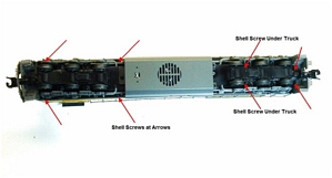 ![]() The arrows point to the shell removal screws. Two screws are under the rear of the front truck |